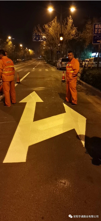 此次標線施工,為不影響市政公路通行,均在夜間車流量較少的時候進行施工,在施工安全第 一的前提下,亨通的同事們保質保量的用高 效率完成了標線試驗段施工,該試驗段被項目部評為施工模范。